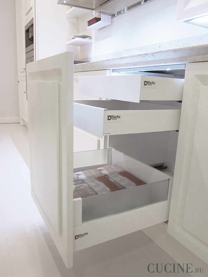 Базы из алюминия, ящики и корзины с направляющими BLUM полного выдвижения и петли, позволяющие регулировать дверь в трех направлениях (с открыванием на 95* и 155*).