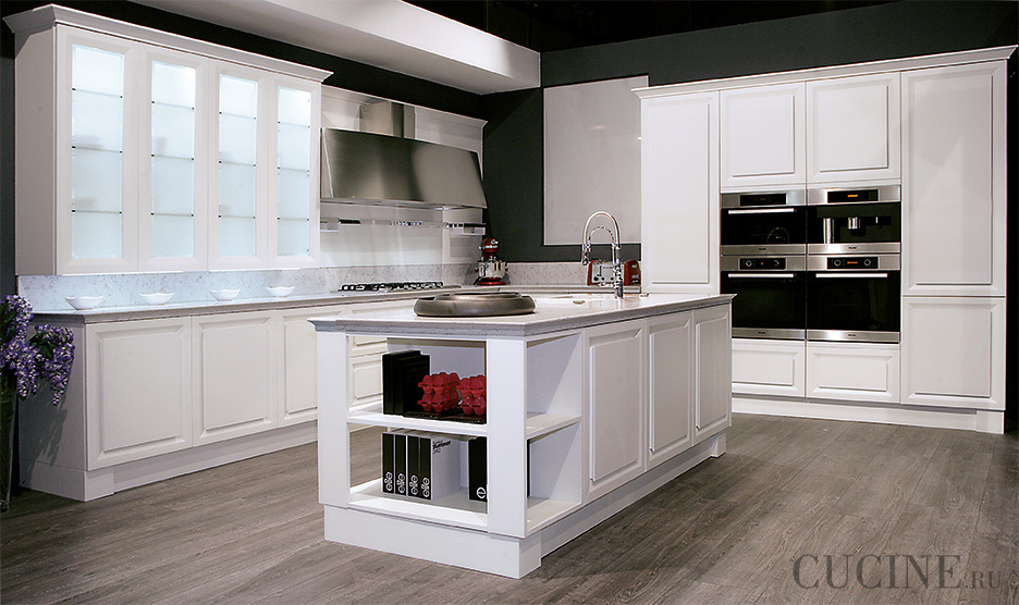 В комплект входят фронтальная композиция, пенал под бытовую технику и остров.